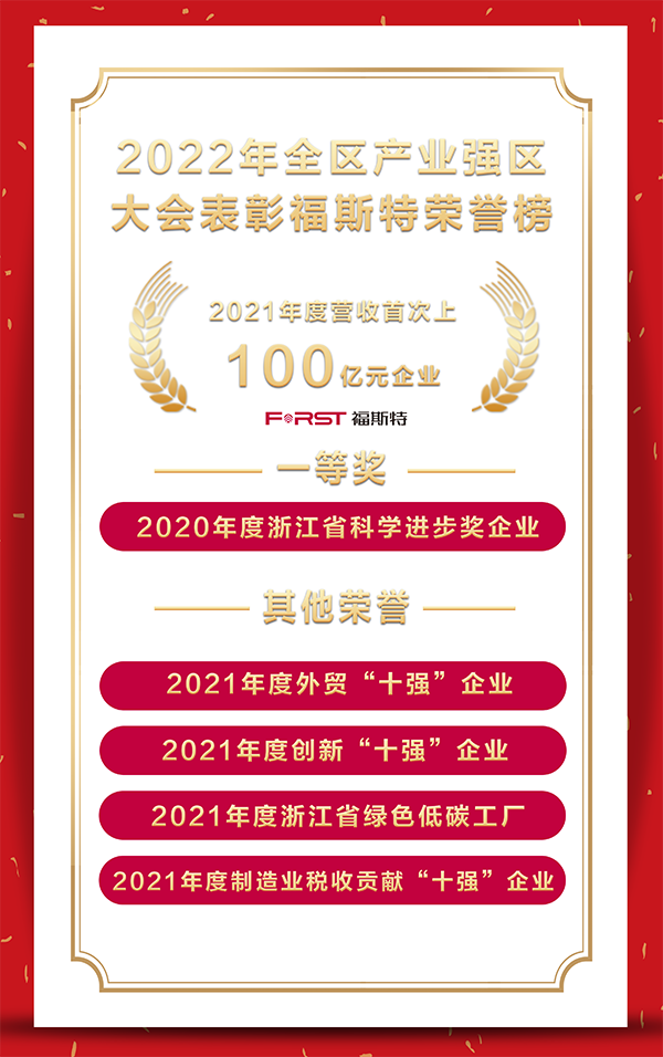 2022年3月21日上午,2021年度臨安全區(qū)產(chǎn)業(yè)強區(qū)大會隆重召開,福斯特榮獲2021年度臨安區(qū)首次營收上“百億企業(yè)”、“制造業(yè)稅收貢獻十強企業(yè)”、“外貿(mào)十強企業(yè)”、“創(chuàng)新十強企業(yè)”等四項榮譽。此外,福斯特獲2021年度浙江省綠色低碳工廠、2020年度浙江省科學(xué)技術(shù)進步一等獎受到大會表彰。董事長林建華代表公司參加頒獎儀式,并作主題交流發(fā)言。