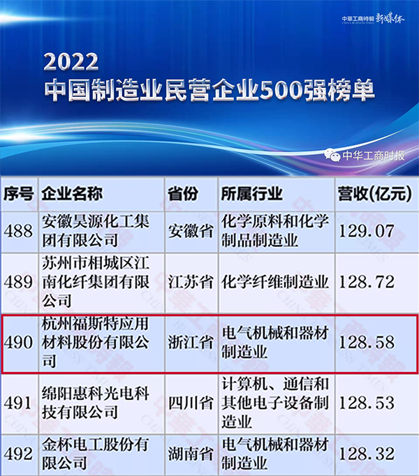 福斯特以2021年度營(yíng)業(yè)收入128.58億元,首次登榜,位列第490名!