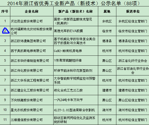 經過初審并組織專家進行評審,經核準評定,共有88個項目擬定為2014年浙江省優(yōu)秀工業(yè)新產品(新技術),其中杭州福斯特光伏材料股份有限公司的高透光率的EVA膠膜順利入圍。