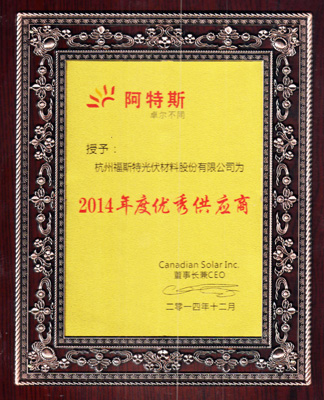 福斯特榮獲阿特斯授予的2014年度優(yōu)秀供應(yīng)商榮譽(yù)稱號(hào)