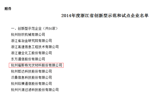 福斯特榮獲2014年度浙江省創(chuàng)新型示范企業(yè)