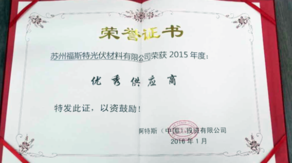 2016年開年之際,福斯特再獲佳績。1月20日,蘇州福斯特光伏材料有限公司應邀參加阿特斯年度供應商頒獎活動,并榮獲阿特斯2015年度優(yōu)秀供應商。