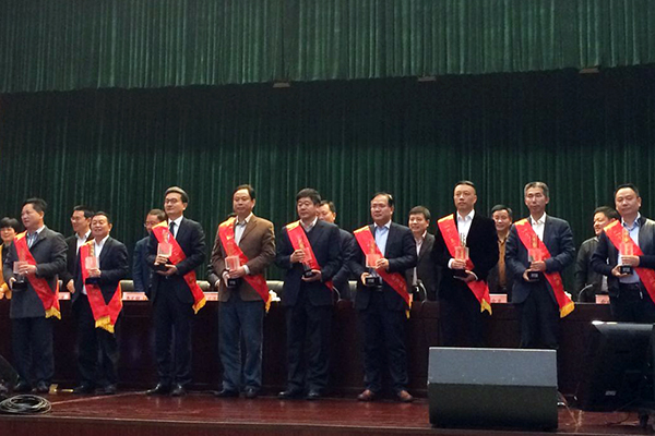 福斯特董事長林建華(左三)被評為臨安市“十二五”杰出貢獻(xiàn)企業(yè)家并接受大會表彰