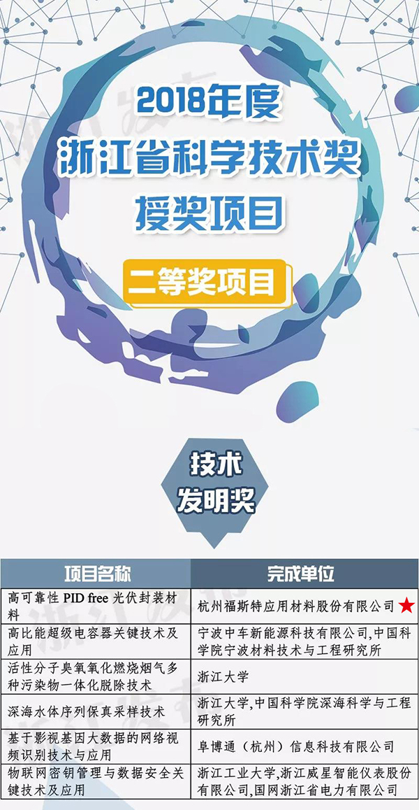 5月14日上午,浙江省科學技術(shù)獎勵大會在杭州舉行。福斯特“高可靠性PID free光伏封裝材料”獲省技術(shù)發(fā)明獎二等獎,該獎項為2018年度浙江省技術(shù)發(fā)明獎最高獎項。福斯特成為臨安區(qū)首個在新材料領域獲得該獎項的單位,并曾榮獲2017年度杭州市科學技術(shù)進步一等獎。
