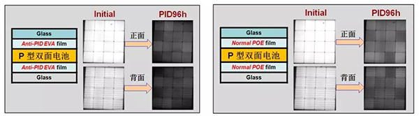 雙面電池組件正面、背面均可受光發(fā)電。因背面發(fā)電,電站端可額外增益5%-30%,發(fā)展優(yōu)勢明顯。同時,雙面電池技術(shù)可兼容IBC、HIT、MBB、半片、疊瓦等多種主流技術(shù),是光伏組件高效之路的首選技術(shù)路線。雙面電池在快速發(fā)展的同時,其因PERC電池背面鈍化不完全而引發(fā)的PID問題凸顯。如無特別防護,雙面電池的背面PID衰減可達(dá)15%-50%。用常規(guī)抗PID的EVA及通用POE膠膜均無法實現(xiàn)長效的抗PID。
