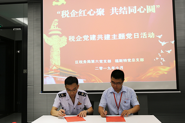 7月3日,主題黨日活動在福斯特總部舉行。雙方黨員代表根據(jù)活動主題進行了“微課演講”,加強企業(yè)供求同頻共振,開拓視野,啟迪思維。會中,雙方共同簽訂了《稅企黨建共建協(xié)議》,建立了稅企黨建合作新模式,通過共建共享進行優(yōu)勢互補。座談會上,稅務局服務團對企業(yè)代表提出的問題進行了現(xiàn)場輔導解答,充分把握企業(yè)涉稅需求,服務企業(yè)健康發(fā)展?;顒又校h員們在黨旗下重溫了入黨誓詞,鞭策自己以更高昂的精神、更扎實的作風踐行對黨的莊嚴承諾。