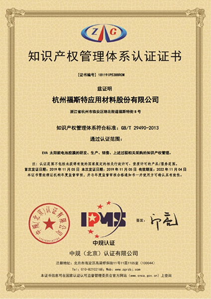 杭州福斯特應(yīng)用材料股份有限公司于2019年11月5日順利通過(guò)知識(shí)產(chǎn)權(quán)管理體系認(rèn)證(貫標(biāo)認(rèn)證),獲得中規(guī)(北京)認(rèn)證有限公司頒發(fā)的認(rèn)證證書(shū),標(biāo)志著我公司在知識(shí)產(chǎn)權(quán)管理體系的建立、實(shí)施工作中取得階段性成果,在知識(shí)產(chǎn)權(quán)創(chuàng)造、運(yùn)用、管理和保護(hù)方面全面具備國(guó)內(nèi)領(lǐng)先水平。