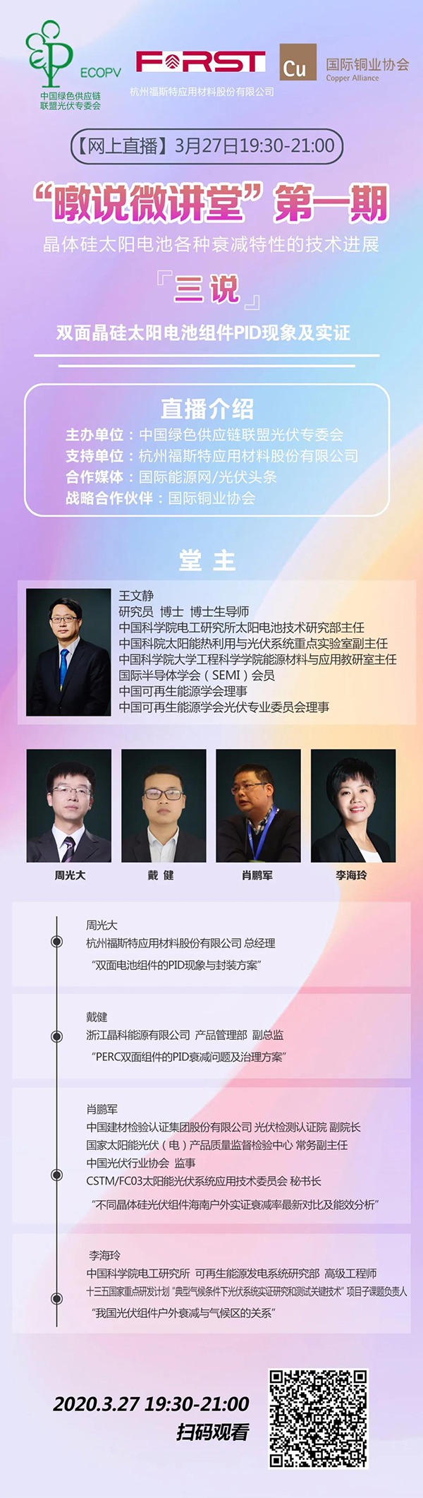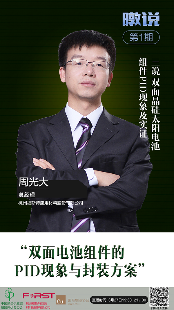中國綠色供應鏈聯(lián)盟光伏專委會(ECOPV)線上課堂“暾說微講堂”第一期將于3月27日開啟。福斯特總經(jīng)理周光大應邀發(fā)表“雙面電池組件的PID現(xiàn)象與封裝方案”主題演講。